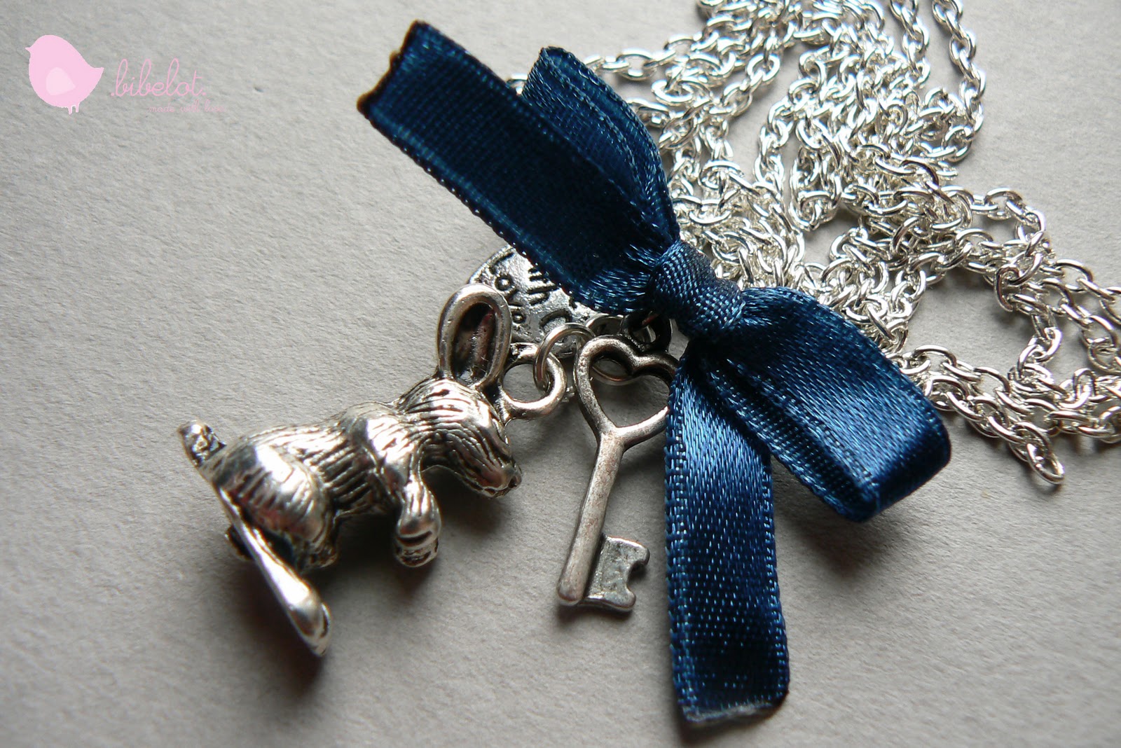bibelot z ażurowym liściem i różnokolorowymi szklanymi perłami . zawieszki w kształcie piórka, skrzydła i klucza . łańcuszek w kolorze srebrnym .